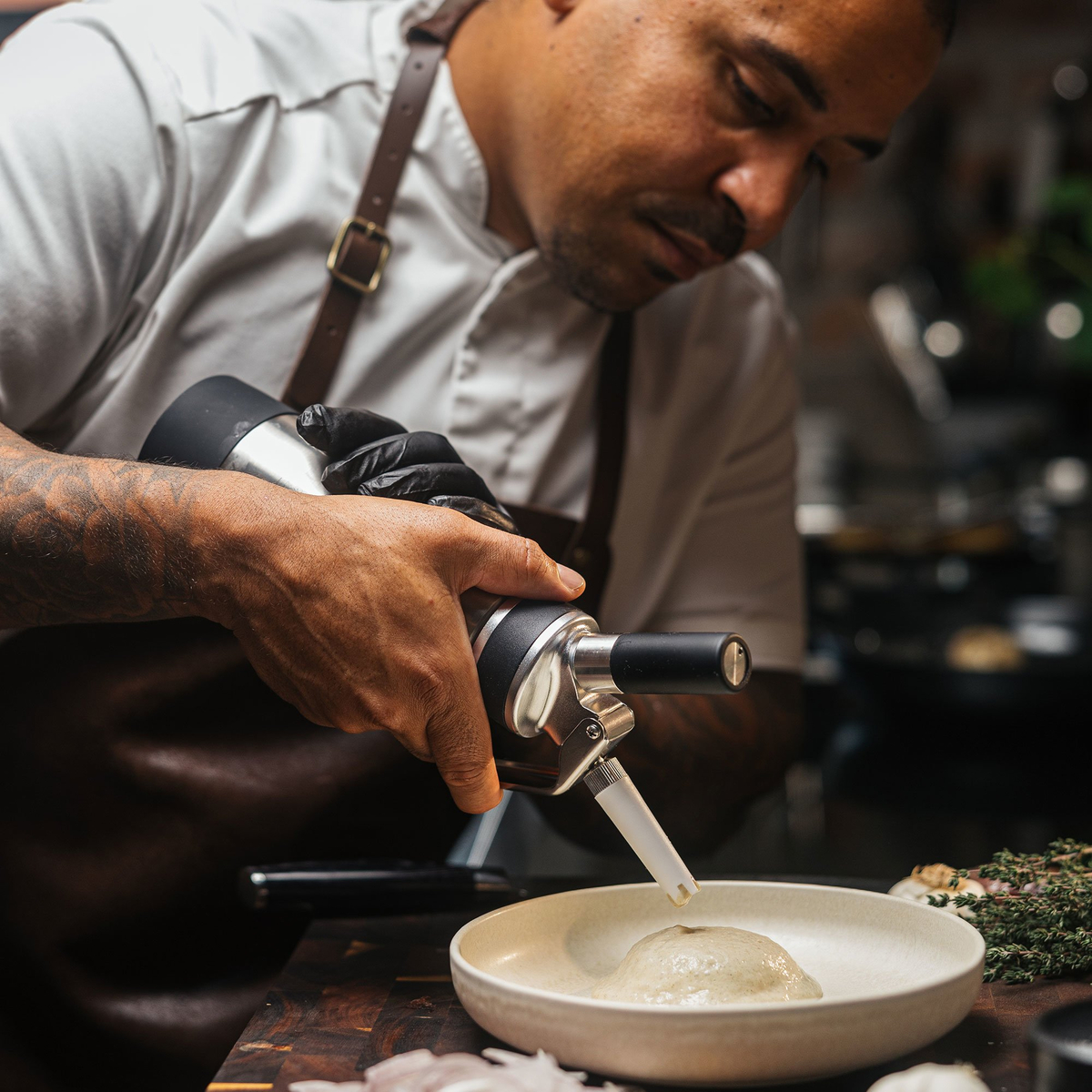 Det er både enkelt og effektivt å bruke sifongen: Fyll sifongen med ønsket innhold, skru på hodet med ønsket munnstykke og fyll på med en eller flere fløtepatroner. Avhengig av innholdet kan det være nødvendig å riste, vri, varme eller avkjøle sifonen. Deretter kan du elegant sprute ut det valgte innholdet, enten det er saus, suppe, røre eller fløte.