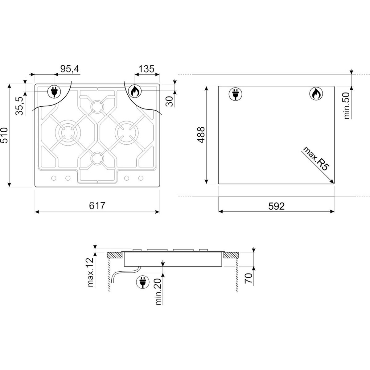 Classic Gass platetopp 60 cm, Rustfritt Stål