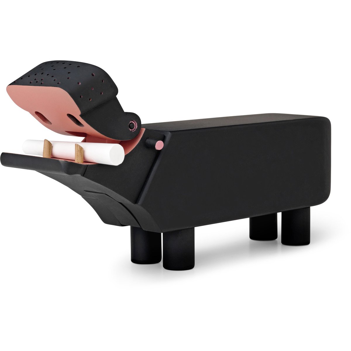 En flodhest i tre fra Kay Bojesen. Flodhesten ble designet i 1955 med tanke på at den skulle brukes på skrivebord. Gapet på flodhesten fungerer nemlig perfekt som en penneholder. Flodhesten er laget av bøk og malt med svart tavlefarge. Skriv beskjeer, notater eller påminnelser på den med vanlig tavlekritt. For at det skal være enklere å skrive på den har flodhesten vokst med 2 cm på høyden og lengden sammenlignet med den ufargede flodhesten som vi allerede har i vårt sortiment. En hvit tavlekritt følger med flodhesten i esken.
