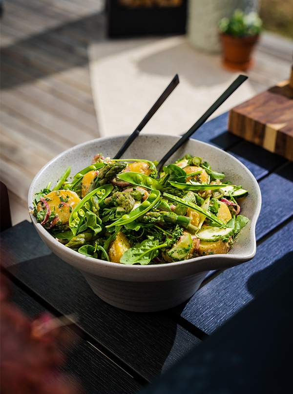 grillfest! På premiärmenyen står grillet lammekoteletter med ferskpotetsalat, sprø rabarbrapai med