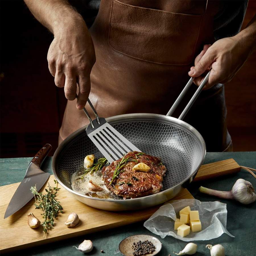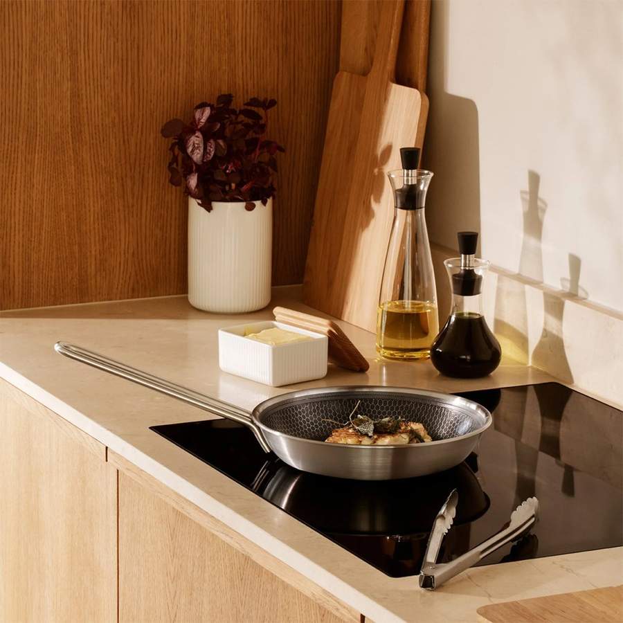 Mosaic fra Eva Solo er utstyrt med en banebrytende keramisk belegg som gjør serien enestående slitesterk. Det unike mosaikkmønsteret består av rustfritt stål på toppen og keramisk Slip-Let®-belegg i bunnen, som gir deg en perfekt stekeoverflate, er enkel å rengjøre og lar deg steke med mindre fett. Tåler bruk av metallredskaper.