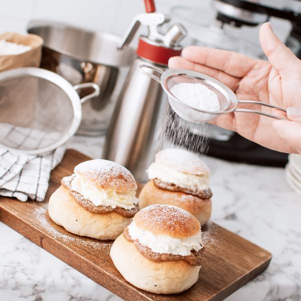 De klassiske hvetebollene eltes i kjøkkenmaskinen og smaksettes med ferskmalt kardemomme. Ønsker du kaldheving, halverer du mengden gjær, bruker kald melk og lar deigen stå tildekket i kjøleskap over natten. Før steking pensles bollene med sukkerlake for en fin glans.
