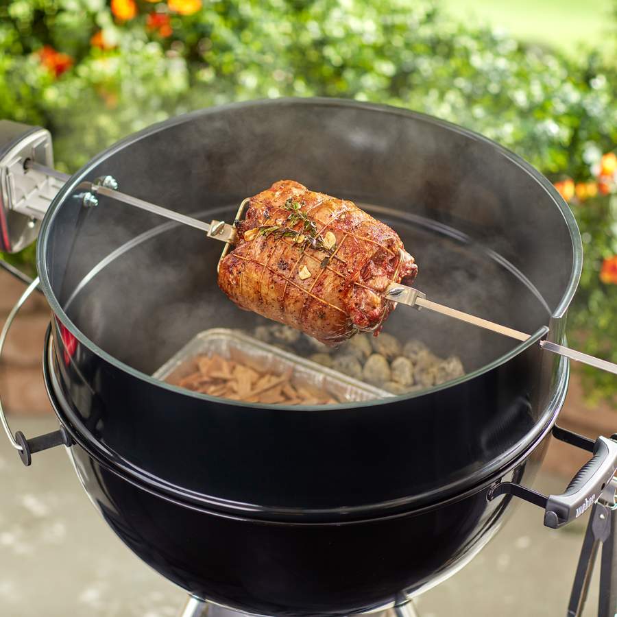 Att tillaga en hel stek på grillen kan vara ganska stressigt om du inte har provat det tidigare. Därför kan du med fördel pryla dig ur det. Börja med att lägga ett rotisseri på grillen, då kan du tillaga din stek jämnt under hela tillberedningstiden.