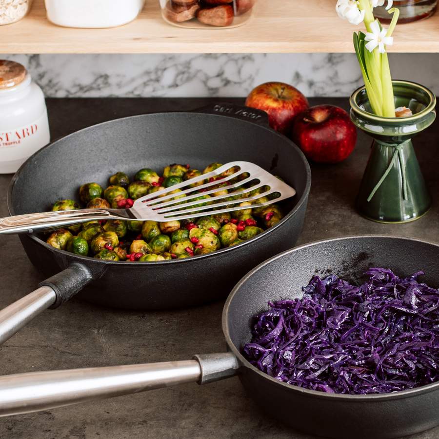 Rosenkål får nytt liv når den stekes gyllenbrun i smør og rundes av med honning og et hint av chili. Dryss over granateplekjerner før servering – det gir både et friskt løft og et lekkert, julete preg. Perfekt som et moderne og friskt innslag på julebordet.