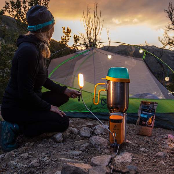 Biolite- portable friluftskjøkken som drives på biomasse og usb-utgang for lading av enheter.