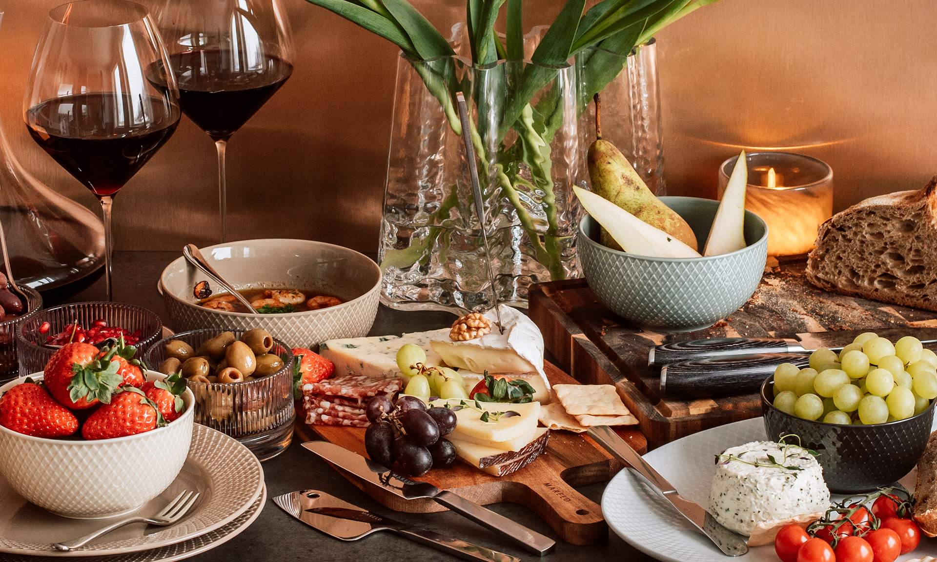 Hva med å feire valentinsdagen med et brett fylt med smaksrike oster, kremete eggerøre, delikat charcuterie og frisk frukt? Skap stemning med et vakkert dekket bord, tente stearinlys og et glass vin. Ta det med ro, nyt hver eneste bit og gjør måltidet til et minneverdig øyeblikk. Hvis du ønsker noe mer fyldig til den romantiske middagen, kan du prøve denne oppskriften på hvitløksstekte reker.