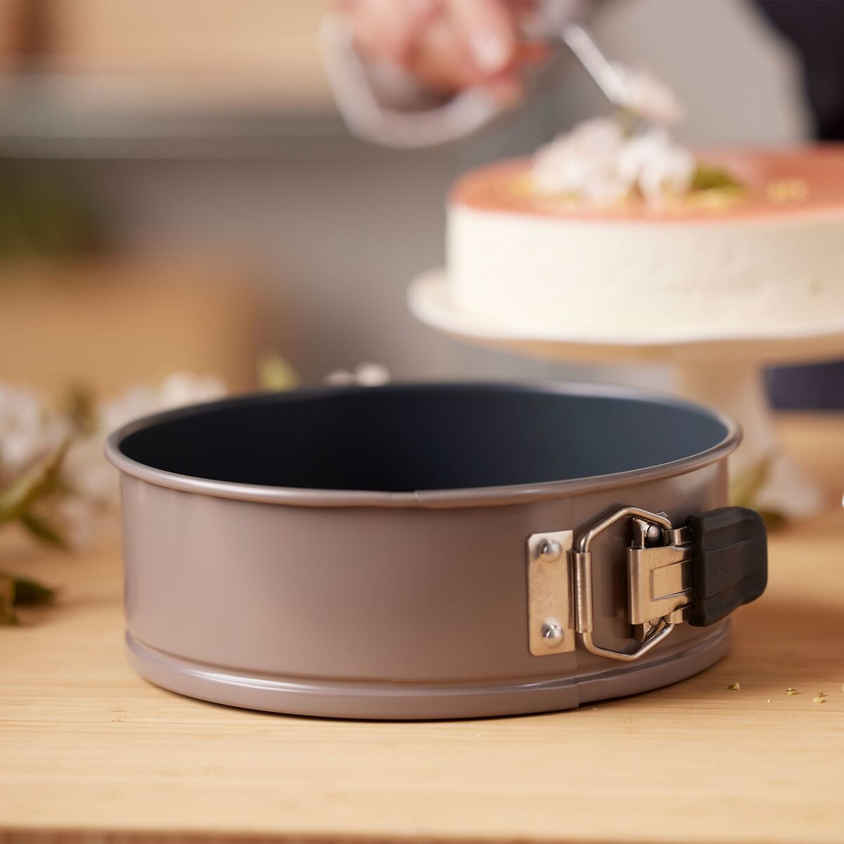 Springformen fra Blomsterbergs er perfekt til ostekake, sjokoladekake, gulrotkake, kake- og dessertbunner. Den er laget av ekstra sterkt stål av høy kvalitet med en 1 millimeter tykk bunn og har et praktisk non-stick-belegg som gjør at brød og kaker slipper lettere. Designet er elegant med en vakker lattefarge på utsiden. Springformen tåler temperaturer opp til maks. 230 °C og bør vaskes for hånd.