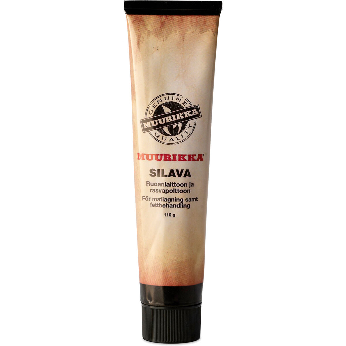 Muurikka Silava stekefett på tube. Perfekt til matlaging samt fettbehandling og vedlikehold av stekeplater, stekepanner, gryter og gassgriller i støpejern eller jern. Muurikka Silava er et universelt stekefett som passer utmerket til steking da det gir maten en sprø og fin overflate. Et rent naturprodukt laget av 70 % flesk av gris og 30 % finsk rapsolje.