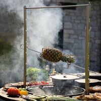 Rotisseriesett til grilling med manuelt roterende spyd til kylling og lignende. Settet inneholder 2 store solide stolper av rustfritt stål, som sitter fast under kokeplaten. På grunn av flammen blir mellomrøret og spydet veldig varmt. Derfor bør du håndtere spydet med en håndske som tåler varme.