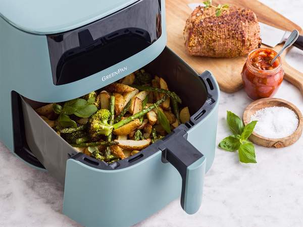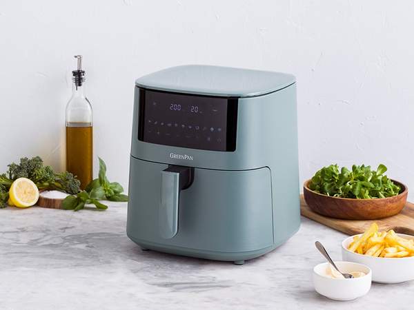 GreenPan Bistro Airfryer XL i Smokey Blue er din allsidige hjelper på kjøkkenet. Med en kapasitet på 7,2 liter kan denne airfryeren tilberede måltider til hele familien