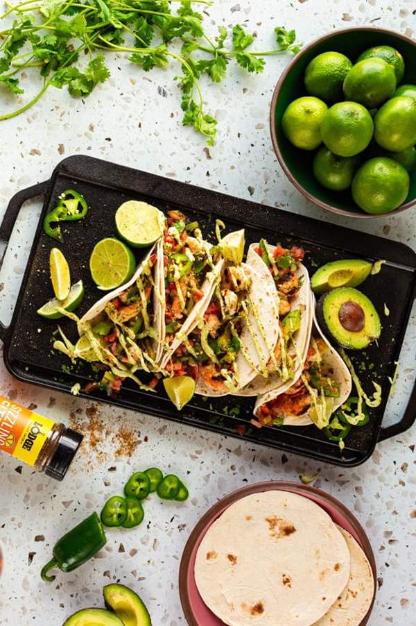 Topp tacoen med pico, grillet avokado, reker og aioli, og pynt deretter med koriander og jalapeño (hvis ønskelig).