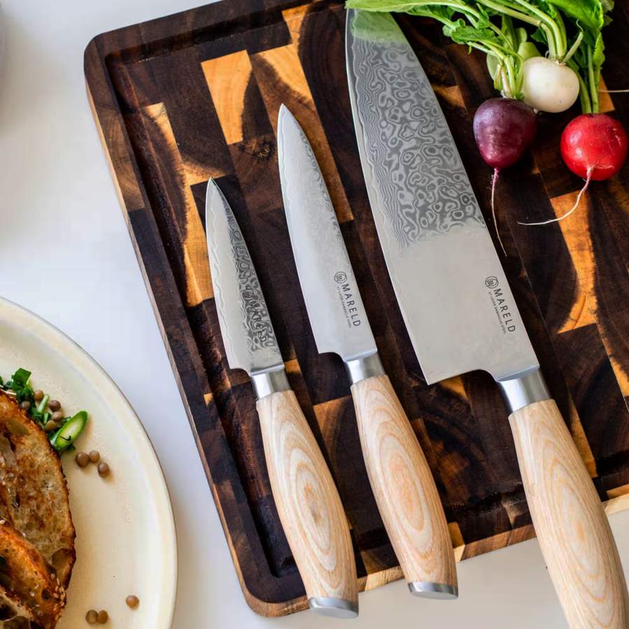 Marelds knivserie Akio er laget med damaskusteknikk i 67 lag, noe som gir et vakkert, unikt mønster på hver kniv. Knivene er nøye utvalgt for å dekke alle behov på kjøkkenet – enten du skal skjære, skive, hakke eller terne. Knivenes håndtak er laget av pakkatre, et kompakt og slitesterkt materiale som både er vannavstøtende og motvirker bakterievekst. Formen på håndtaket er avrundet på midten og smalner inn mot skaftet, noe som gir deg et godt og sikkert grep, uansett hvilken teknikk du bruker.