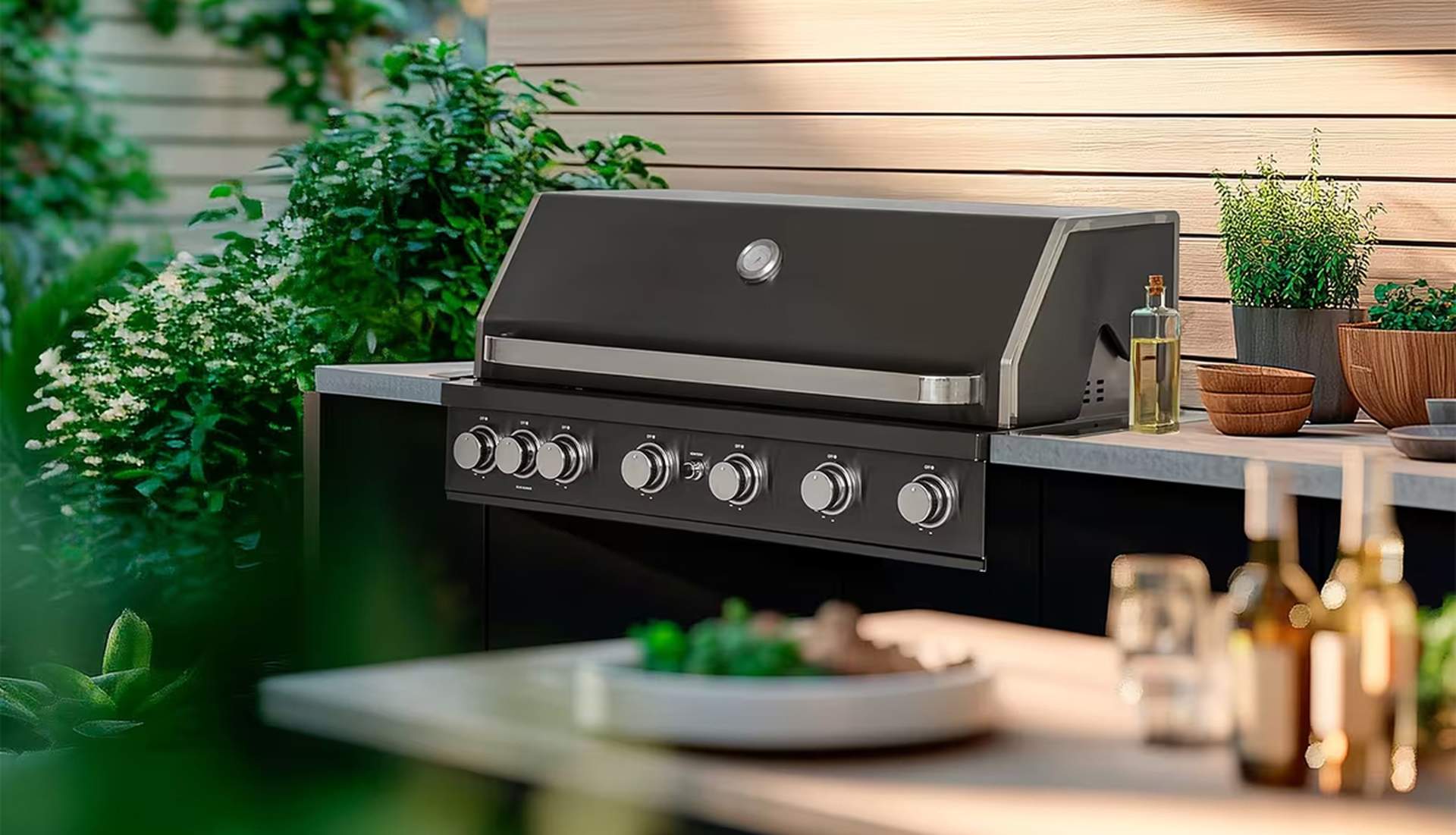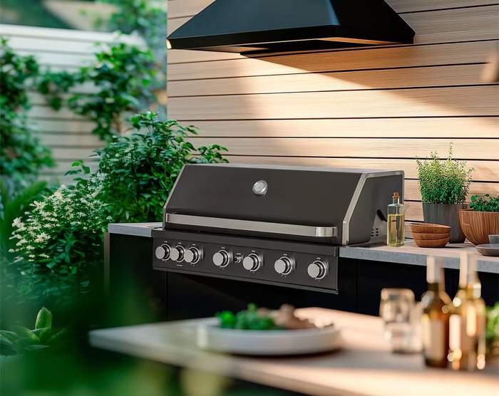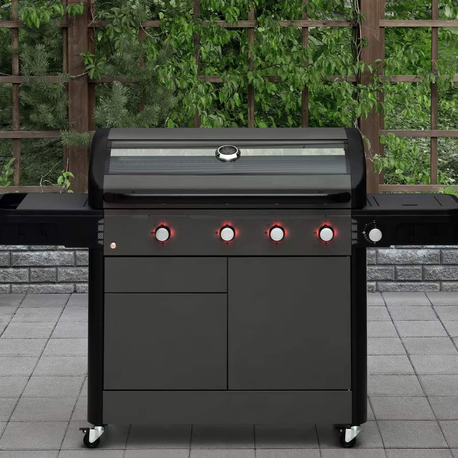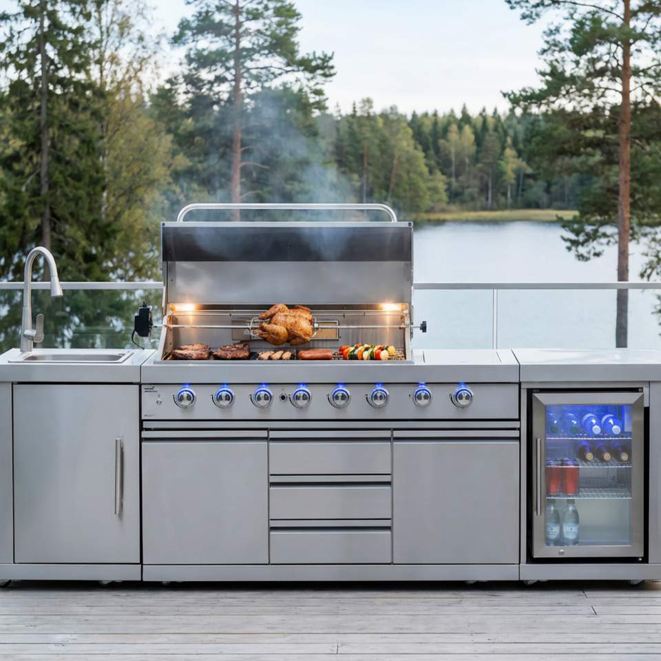 som rustfritt stål og tilbyr funksjoner som rotisseri, sidebrenner og avansert varmekontroll for fleksibel og presis matlaging.