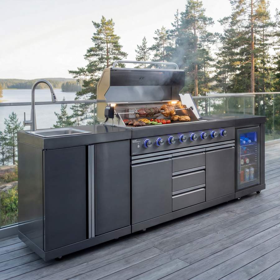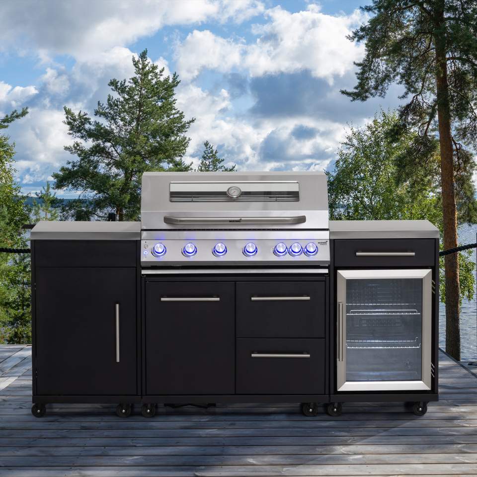 Storslåtte, opplyste og romslige utekjøkken er de ekte kongene på terrassen. Den generøse grillflaten er perfekt for grillfester, og sidebrenneren passer ypperlig til grønnsaker, poteter og sauser. Grillen har også eget kjøleskap, vannkran med vask og rikelig med oppbevaringsplass. Mustang Ametist og Black Diamond har nærmest alt du trenger for et komplett utekjøkken.