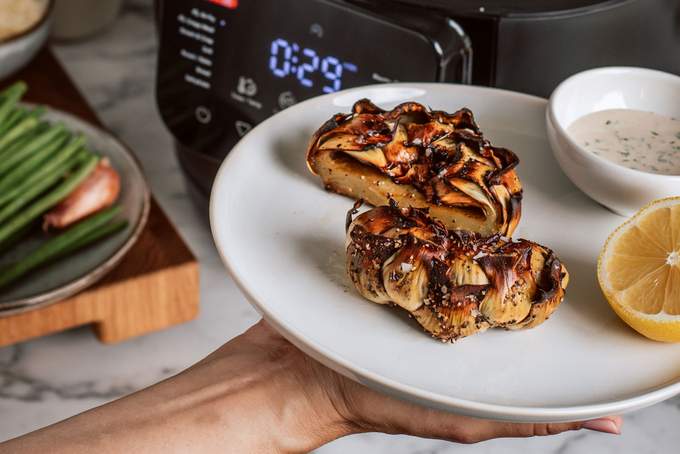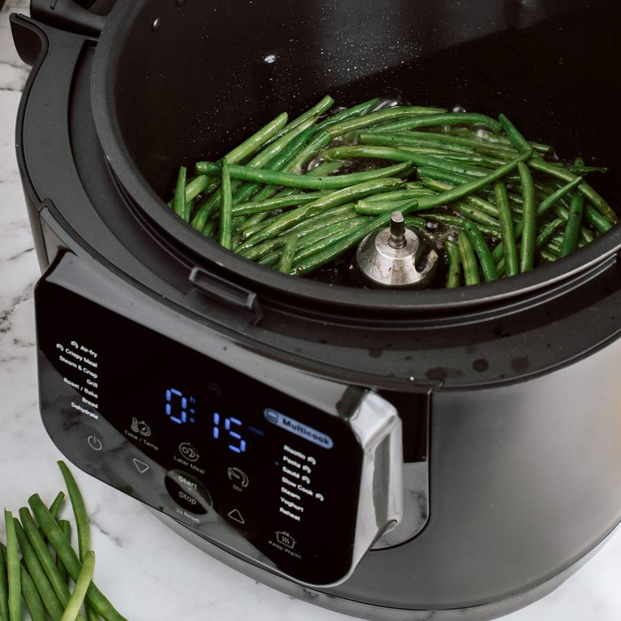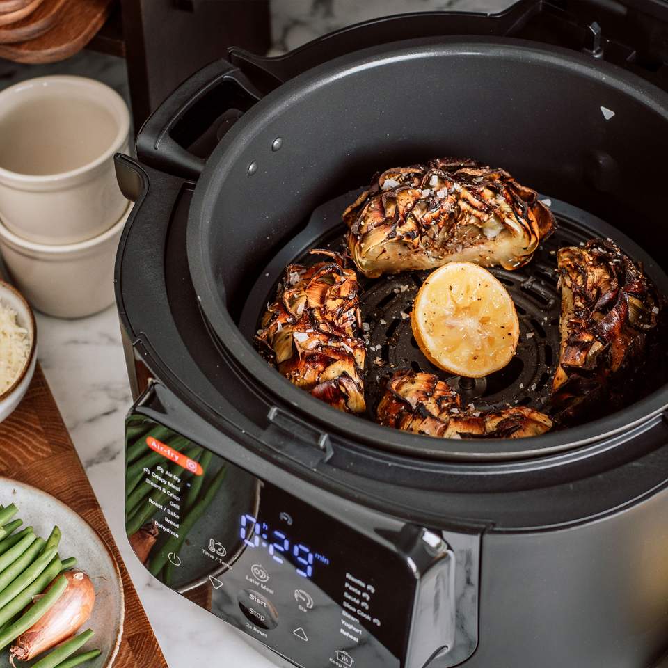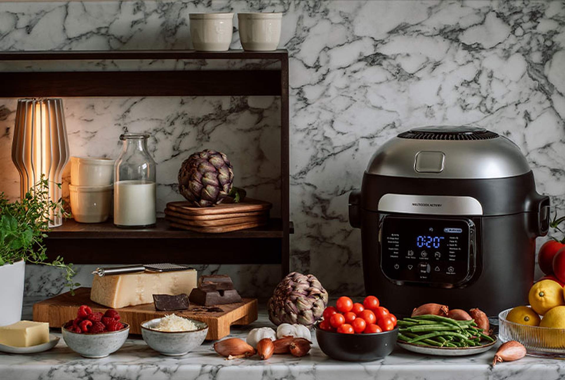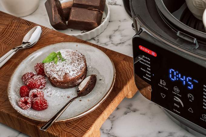 Røre-pedalen blander automatisk under tilberedningen, slik at du ikke trenger å røre eller riste innholdet i multicookeren. Multicookeren har også mulighet for to ulike tilberedninger samtidig med airfrying og damping.