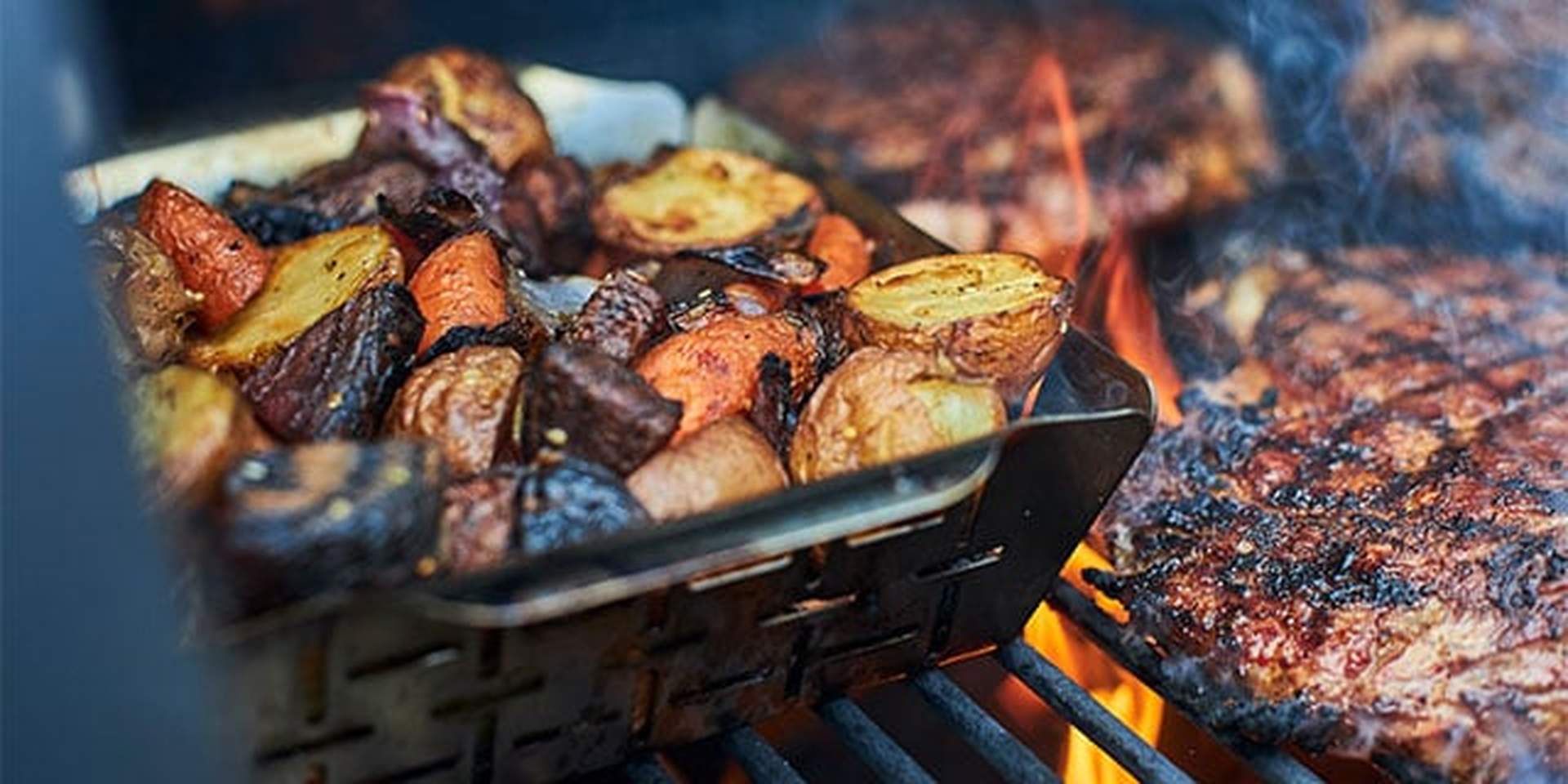 Fargerike, grillede grønnsaker på en nystekt pizza. Zucchini og squash med grillstriper som tilbehør til høstens festmåltider. Eller en herlig blanding av oppkuttede grønnsaker der grillingen lokker frem smaker du ikke engang visste fantes. Med Deluxe grillkurv kan du enkelt tilberede skivede grønnsaker eller små kjøttbiter.